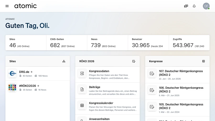 Nach dem Login öffnet sich standardmäßig das Dashboard. Es ist die persönliche Übersichtsseite in atomic und dient als zentraler Einstieg in die tägliche Arbeit.