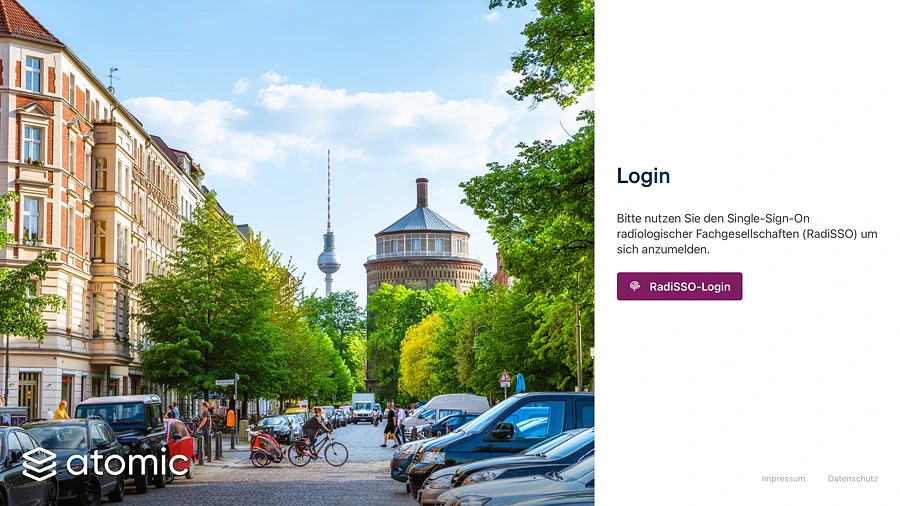 Für Nutzer:innen der Deutschen Röntgengesellschaft steht ausschließlich der RadiSSO-Login als Anmeldeweg zur Verfügung. RadiSSO ist der gemeinsame Single-Sign-On radiologischer Fachgesellschaften und ermöglicht die Anmeldung mit einem zentralen Konto bei verschiedenen digitalen Angeboten. Über die Schaltfläche „RadiSSO-Login“ gelangt man auf die RadiSSO-Anmeldeseite. Dort kann die Anmeldung entweder per E-Mail-Adresse und Passwort oder über einen sog. Passkey erfolgen.
