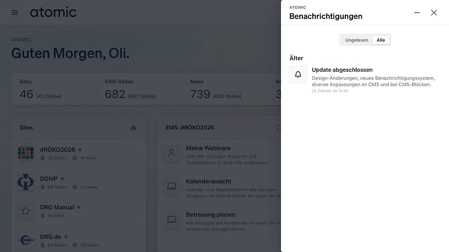 Über die Glocke in der NavBar lässt sich das Benachrichtigungspanel als seitliches Overlay öffnen. Hier werden unterschiedliche Hinweise zentral gebündelt.
