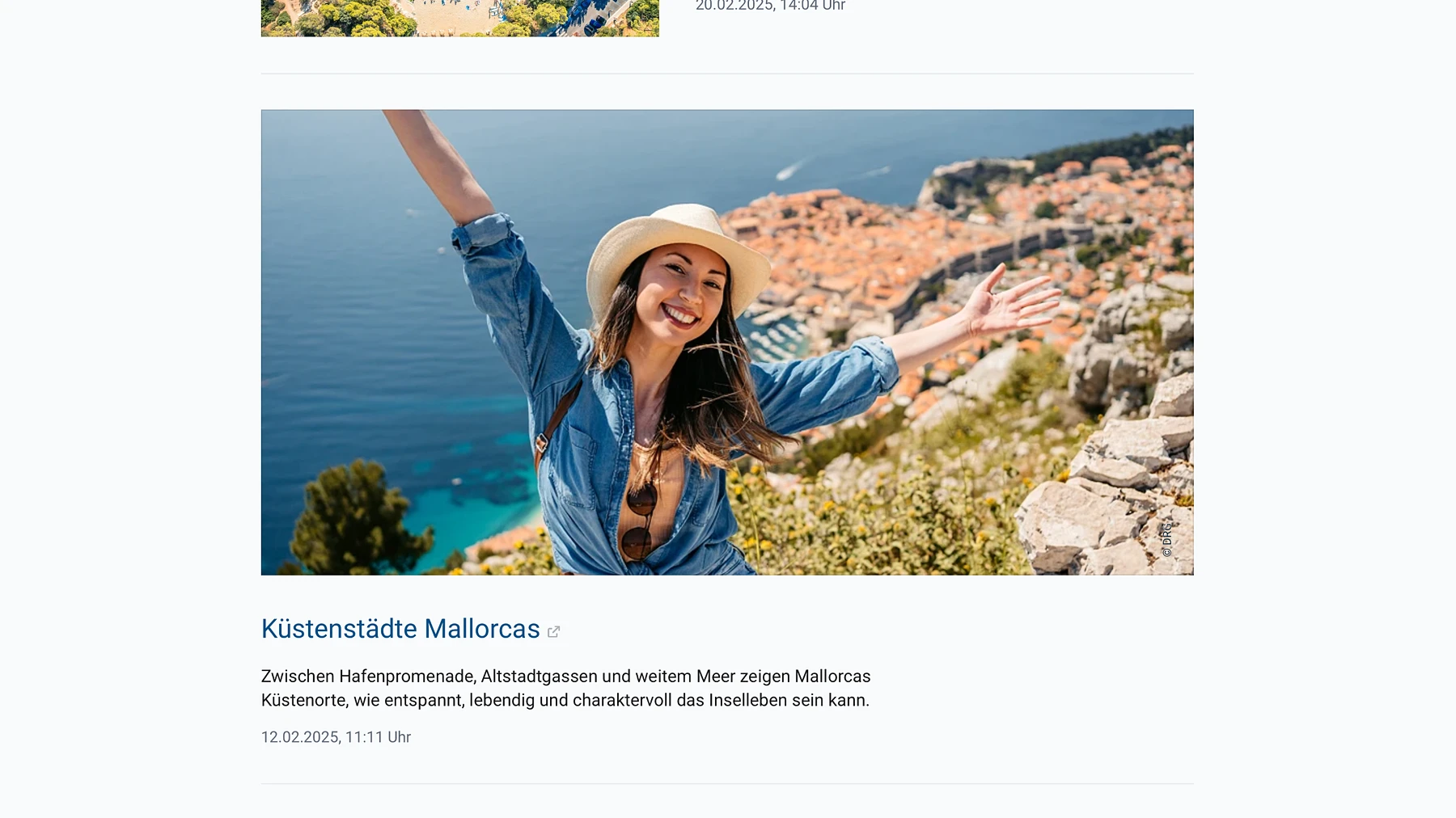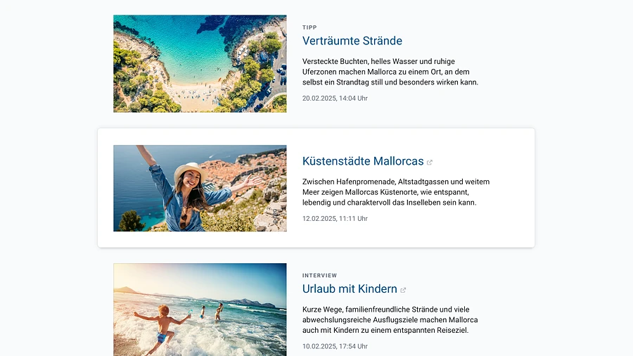 Die Liste folgt stärker dem Charakter eines redaktionellen Nachrichtenstroms. Beiträge erscheinen untereinander und können in ihrer Gewichtung deutlicher variieren. Gerade hier kommen die Ausspielungsoptionen besonders zur Geltung: Einzelne Beiträge können durch ein Großbild mehr Präsenz erhalten oder durch eine Hervorhebung als weiß hinterlegte Kachel visuell aus dem Fluss heraustreten. Dadurch lässt sich innerhalb einer Liste gezielt steuern, welche Beiträge zuerst auffallen und welche eher den laufenden Kontext bilden.
