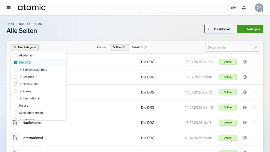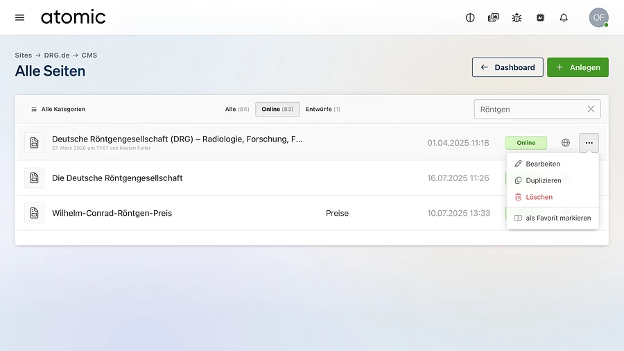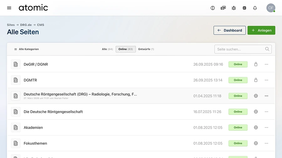 Suche, Filter, Statusanzeige und Aktionsmenüs funktionieren dort nach demselben Prinzip. Wer die Seiten-Übersicht verstanden hat, findet sich deshalb auch in anderen Inhaltsbereichen von atomic schnell zurecht.