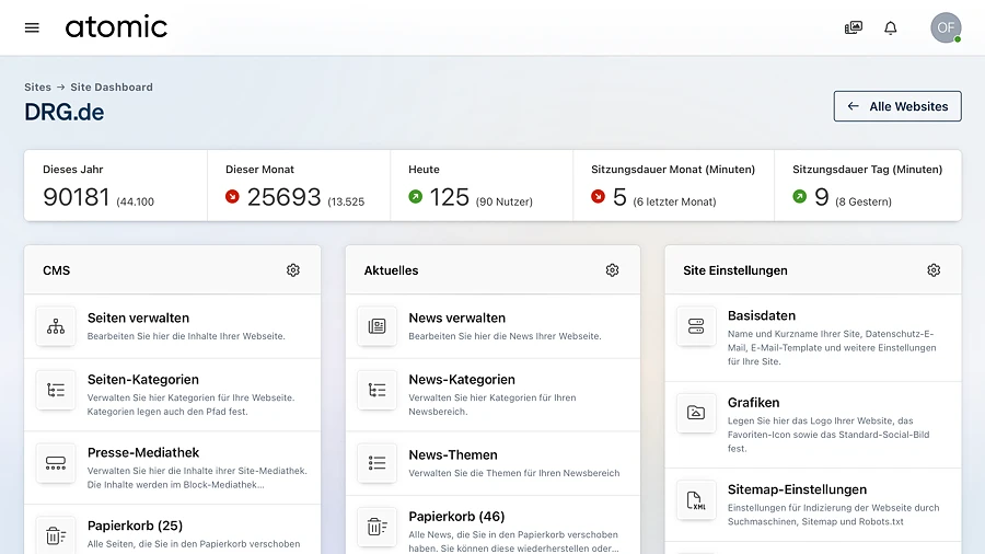 Am Beispiel von DRG.de zeigt sich, wie eine umfangreich konfigurierte Site in atomic aufgebaut sein kann. Im oberen Bereich des Dashboards befindet sich eine Kennzahlenleiste mit zentralen Zugriffswerten der Site. Angezeigt werden die Besuche in diesem Jahr, in diesem Monat und am heutigen Tag, jeweils ergänzt um die Anzahl eindeutiger Nutzer:innen. Zusätzlich werden Werte zur Sitzungsdauer dargestellt. Trendindikatoren machen sichtbar, ob sich die Entwicklung im Vergleich zu vorherigen Zeiträumen positiv oder negativ verändert.