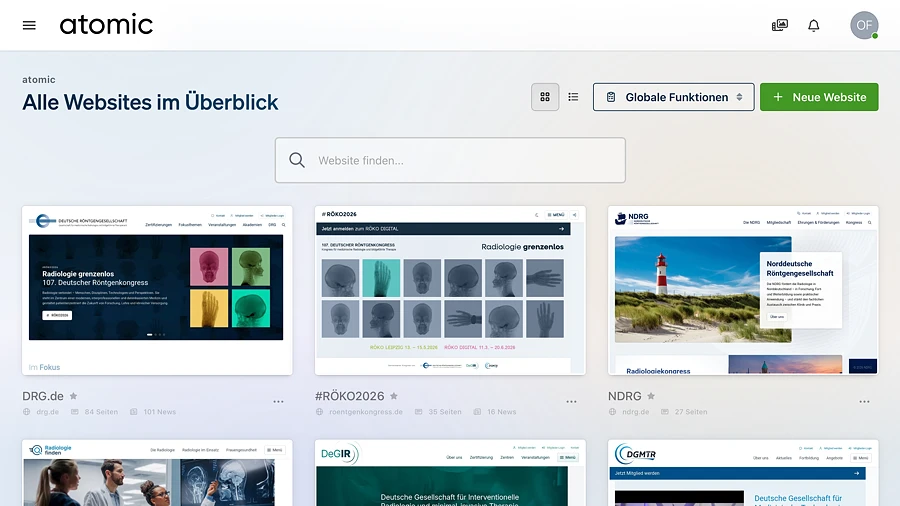 Die Site-Übersicht fasst alle Sites zusammen, auf die eine angemeldete Person Zugriff hat. Sie ist der zentrale Einstieg in die in atomic betreuten Webangebote.